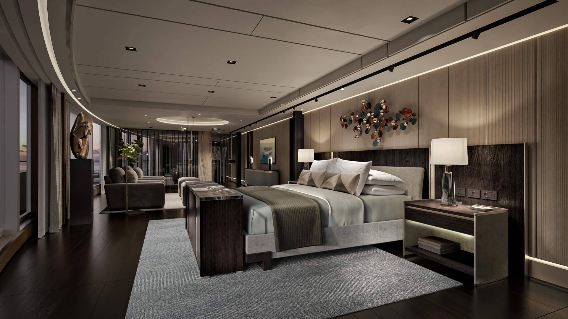 Entre sus prestaciones destacan un balcón envolvente de 344 m² con vistas de 270 grados sobre la proa, una escalera flotante de piedra natural, ascensor privado, gimnasio y sauna propios. La experiencia se completa con mayordomo dedicado, tratamientos diarios en el Serene Spa & Wellness™, automóvil con chófer en cada puerto y atenciones de cortesía con champagne Dom Pérignon y caviar.